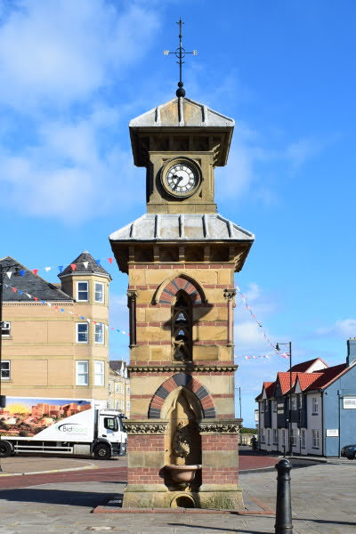 The distinctive clock tower and drinking fountain is located at the head of Front Street in Tynemouth, close to Tynemouth Priory. The Venetian Gothic style clock tower was built in 1861, designed by Oliver and Lamb of Newcastle.