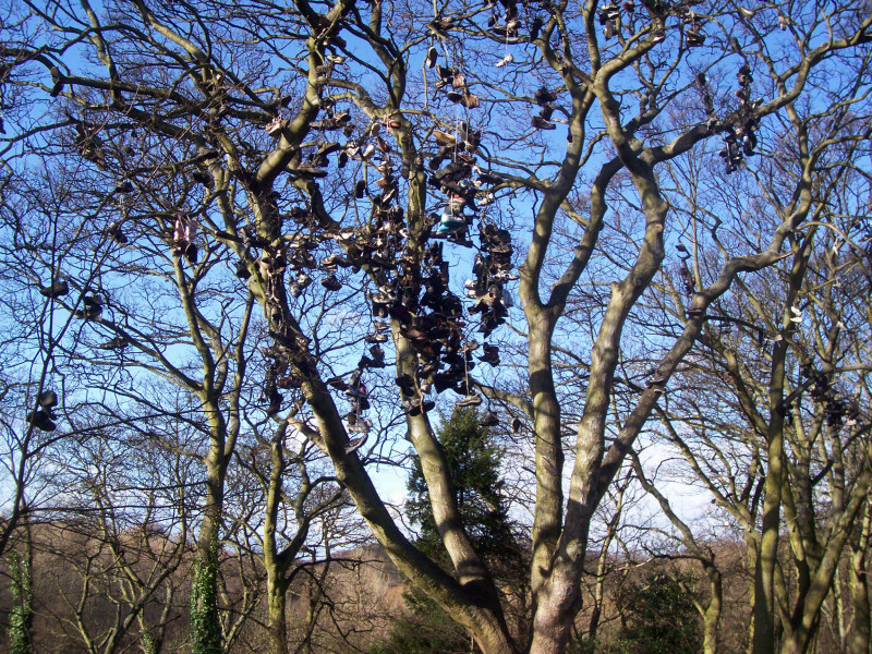 A nearby sign about the shoe tree says The shoe tree is an old Sycamore, which reaches nearly 40 metres high. There are lots of different stories about how the shoe tree came about, but it is thought some time ago this fine, but ordinary tree became the shoe tree when young people celebrated the completion of their exams by throwing their shoes high into the branches. This has continued and there are now shoes of all different types, showing the fashion trends of the last 20 years. The shoe tree was made famous by the novel "The Taxi Driver's Daughter" by Julia Darling.