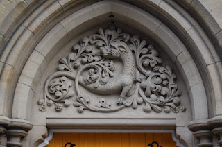 Gabled west front has ten arched windows under a 5-bay arcade. Gabled porches have double doors with elaborate hinges, shouldered surrounds and carved tynpana. Lancet windows in side aisles. Complex high roofs, with slate hung central lantern and tall octagonal spire.