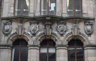 Right return to Westgate Road continues plinth and has giant Corinthian pilasters to segmental pediment containing large sunburst. Copper-covered blocking course ornamented with repeated S. Roof curved over corner bay.
